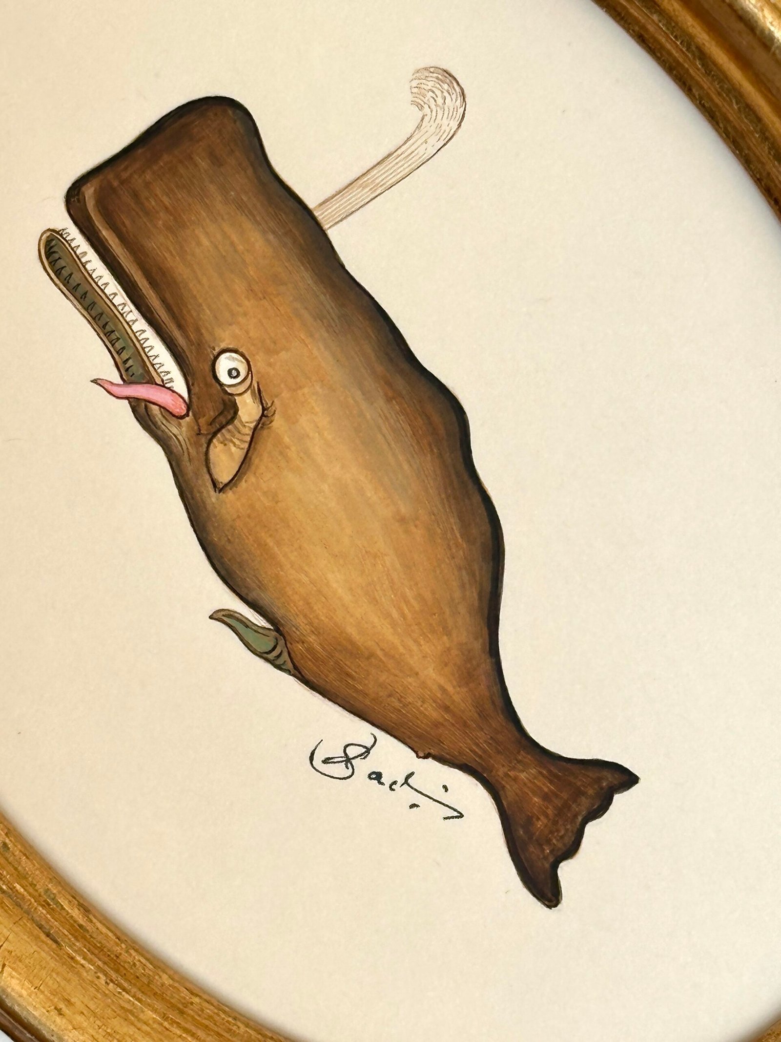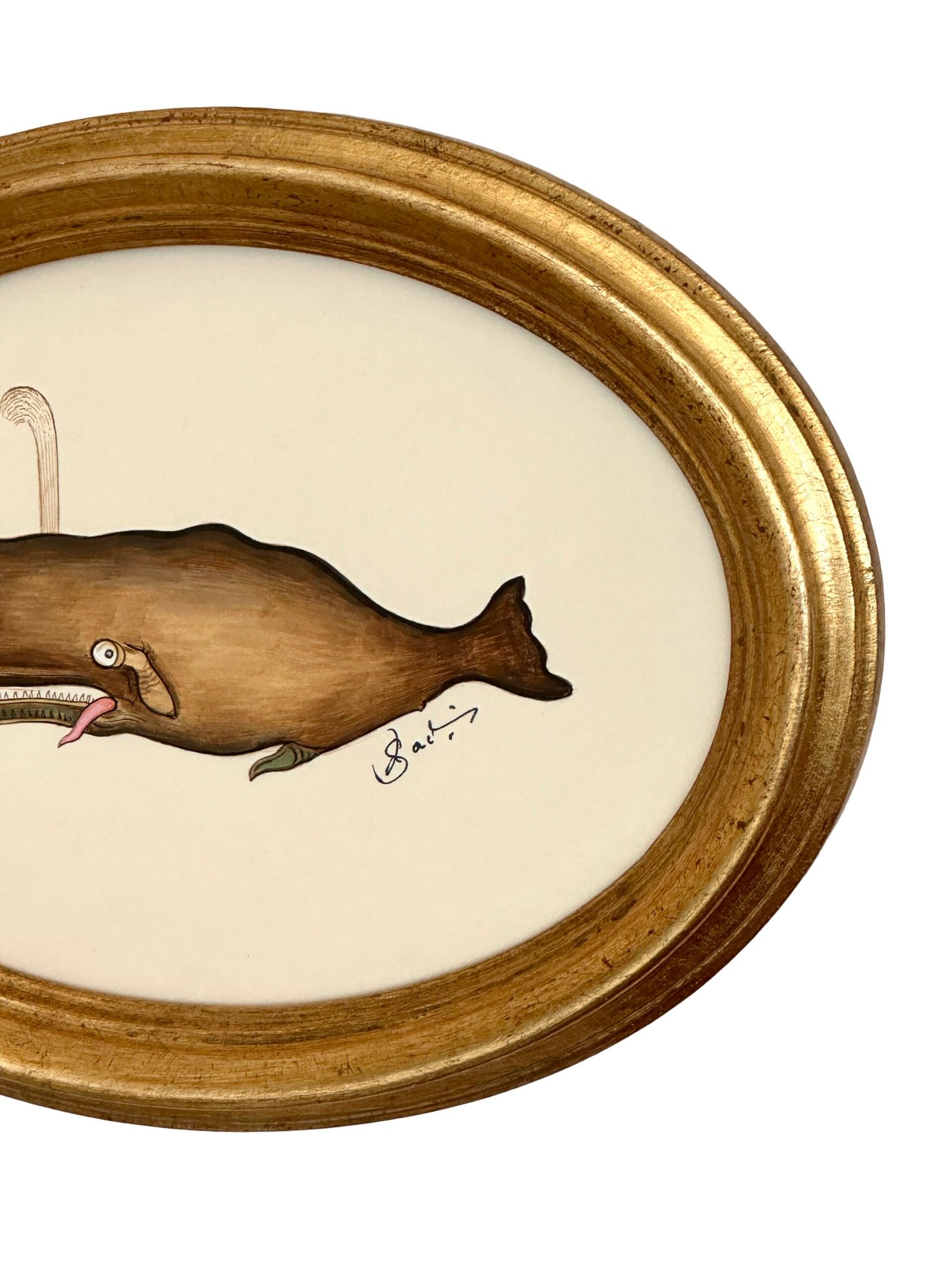 Meet Bruno, a cheeky little baby whale with the most playful expression—wide curious eyes, a tiny tongue, and a hint of mischief. Hand-painted by our master artists in warm, earthy browns with delicate shading and a soft pop of pink, he’s full of personality. Set in a vintage oval gold frame, Bruno is small, charming, and impossible not to love.