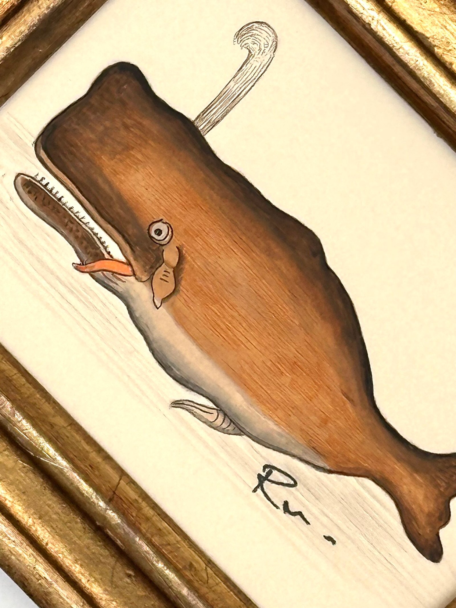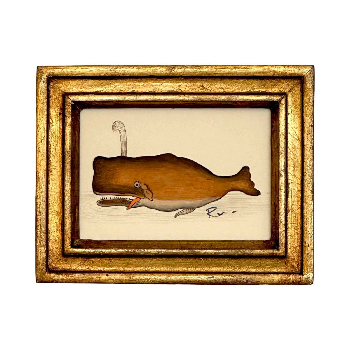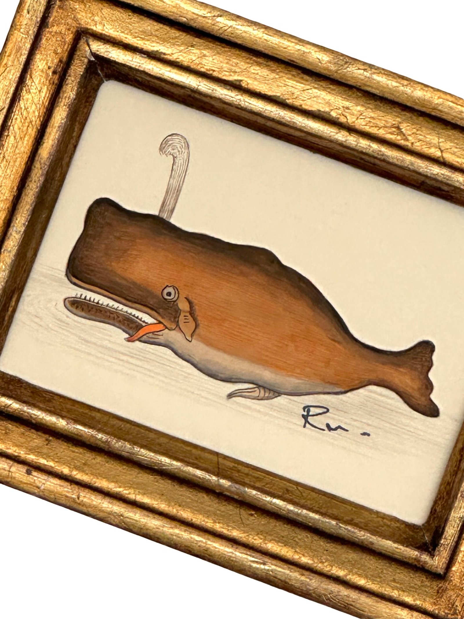 Meet Squishy, our adorable hand-painted baby whale who’s full of personality! Painted in warm shades of brown and black, every brushstroke brings out his playful charm and sweet little details. And can we talk about that tiny pop of orange on his tongue? It adds the perfect splash of whimsy, making him simply irresistible. Nestled in a vintage gold frame, Squishy is ready to bring a smile wherever he goes.