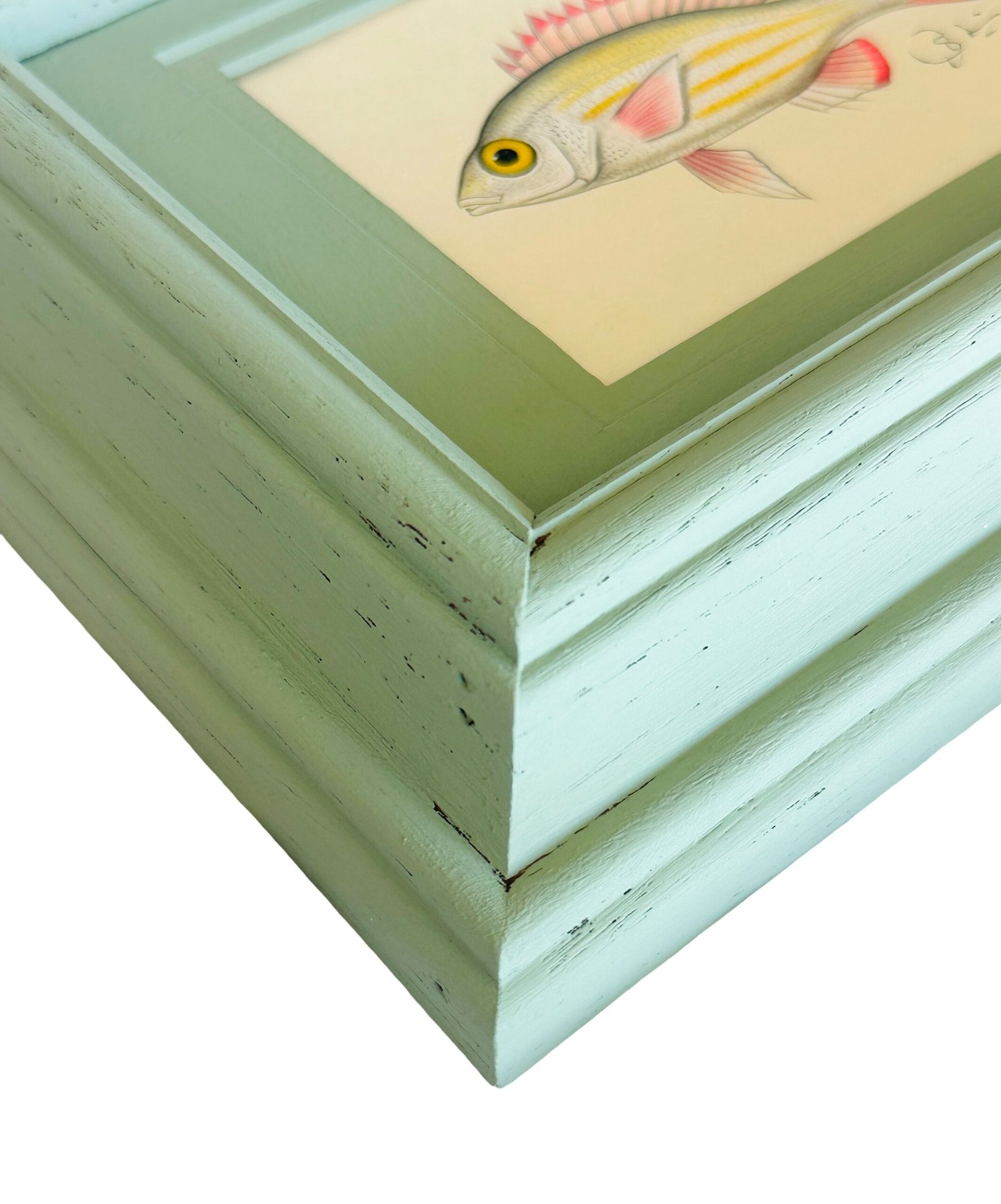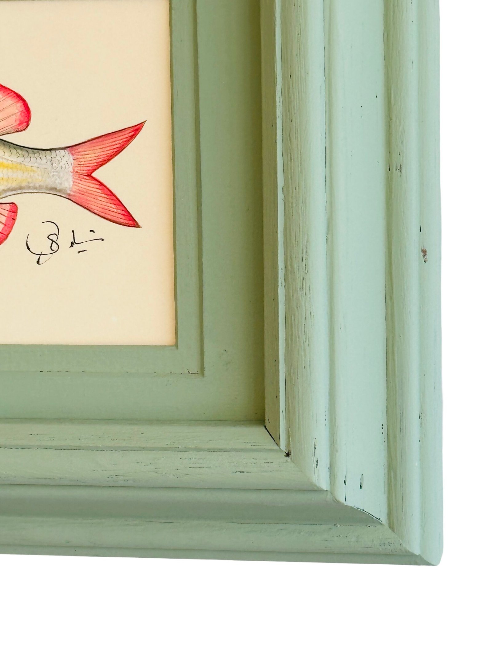 - Framed in a hand-painted vintage frame with a matching hand-painted sage-green mat in a matte finish, and protected under glass.
