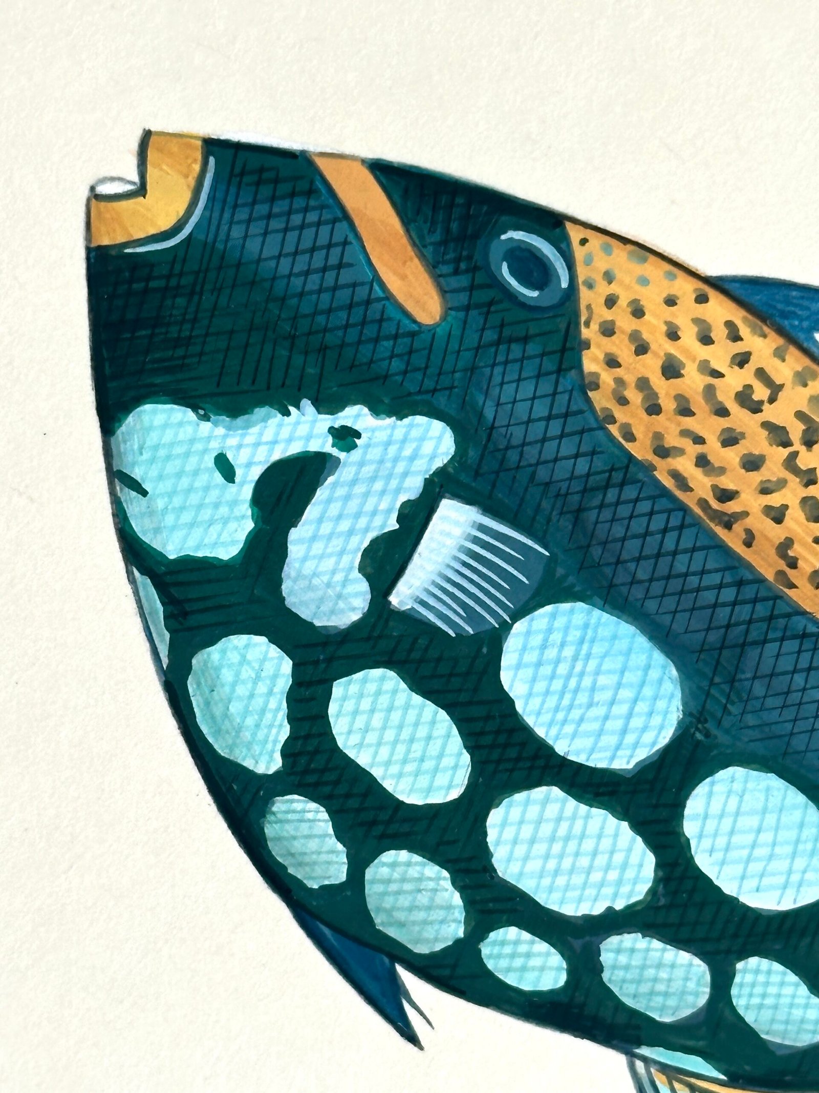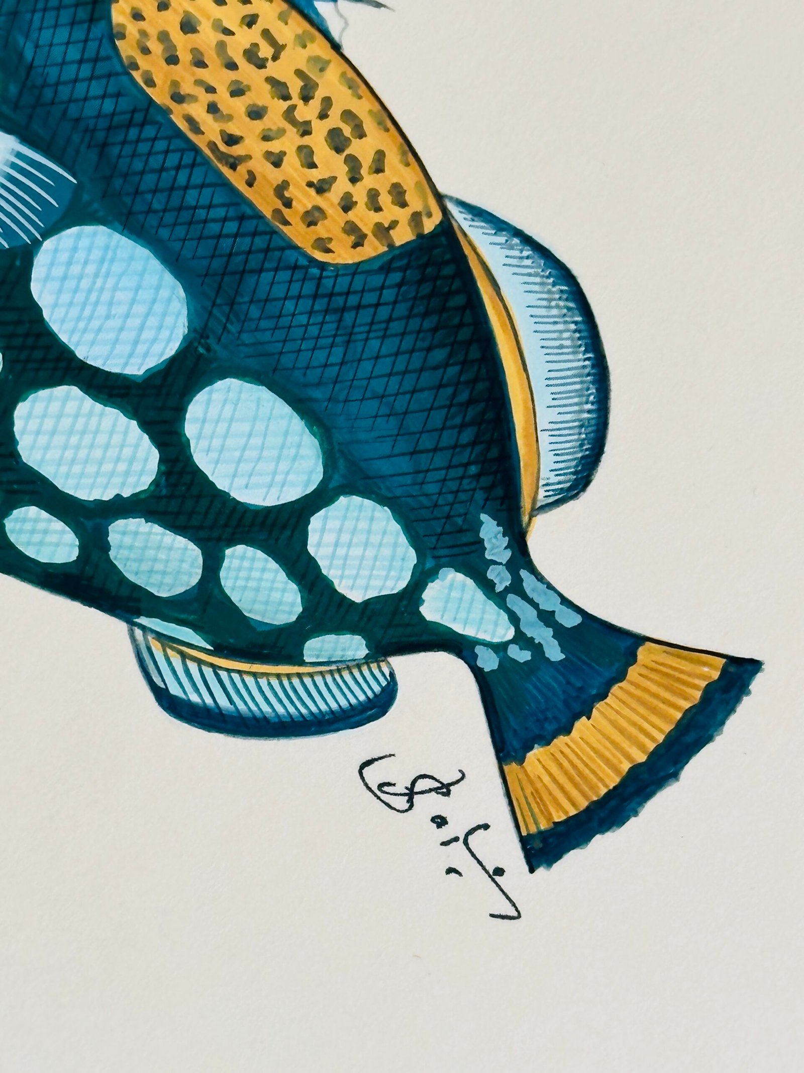 A tiny splash of joy, Niblet swims in the prettiest mix of deep teal blues, soft seafoam, and sunny golden accents that make every detail pop. The playful contrast of those cool ocean tones with the warm mustard speckles gives this little fish so much personality — bold, cheerful, and just a little mischievous. Look closely and you’ll see the magic: delicate cross-hatching, gentle shading, and the tiniest highlights along the fins and scales — the kind of nuanced detailing that only master artists can achieve by hand. Every brushstroke adds depth and movement, as if Niblet might flick its tail and glide away at any moment.