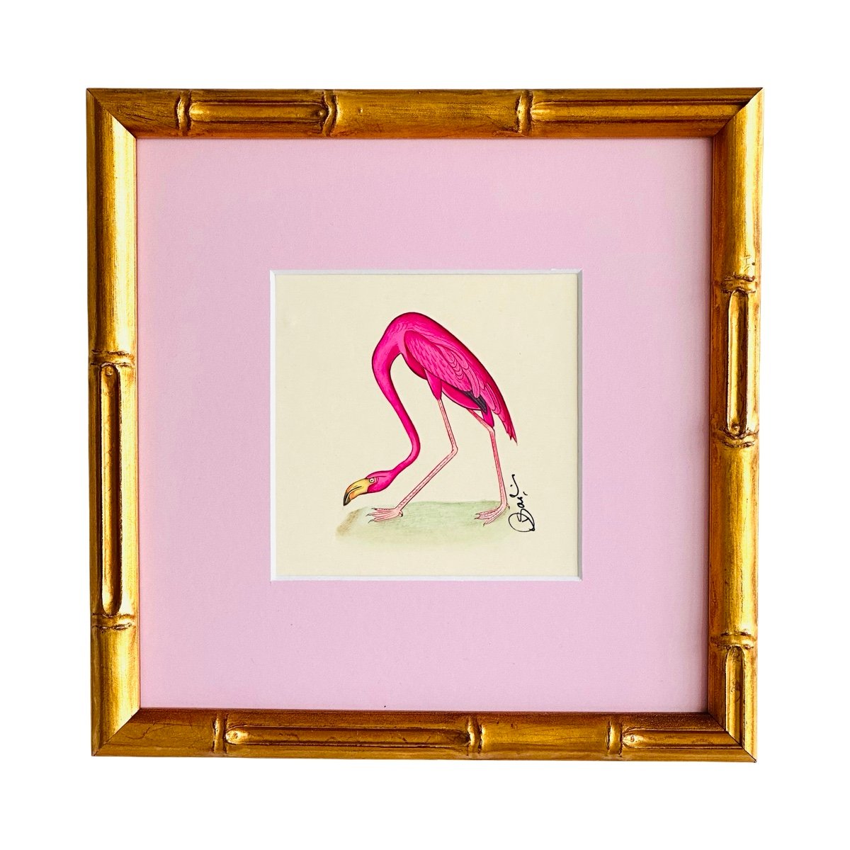 - Framed in a Gold finish Bamboo frame with glass & white acid free mat.