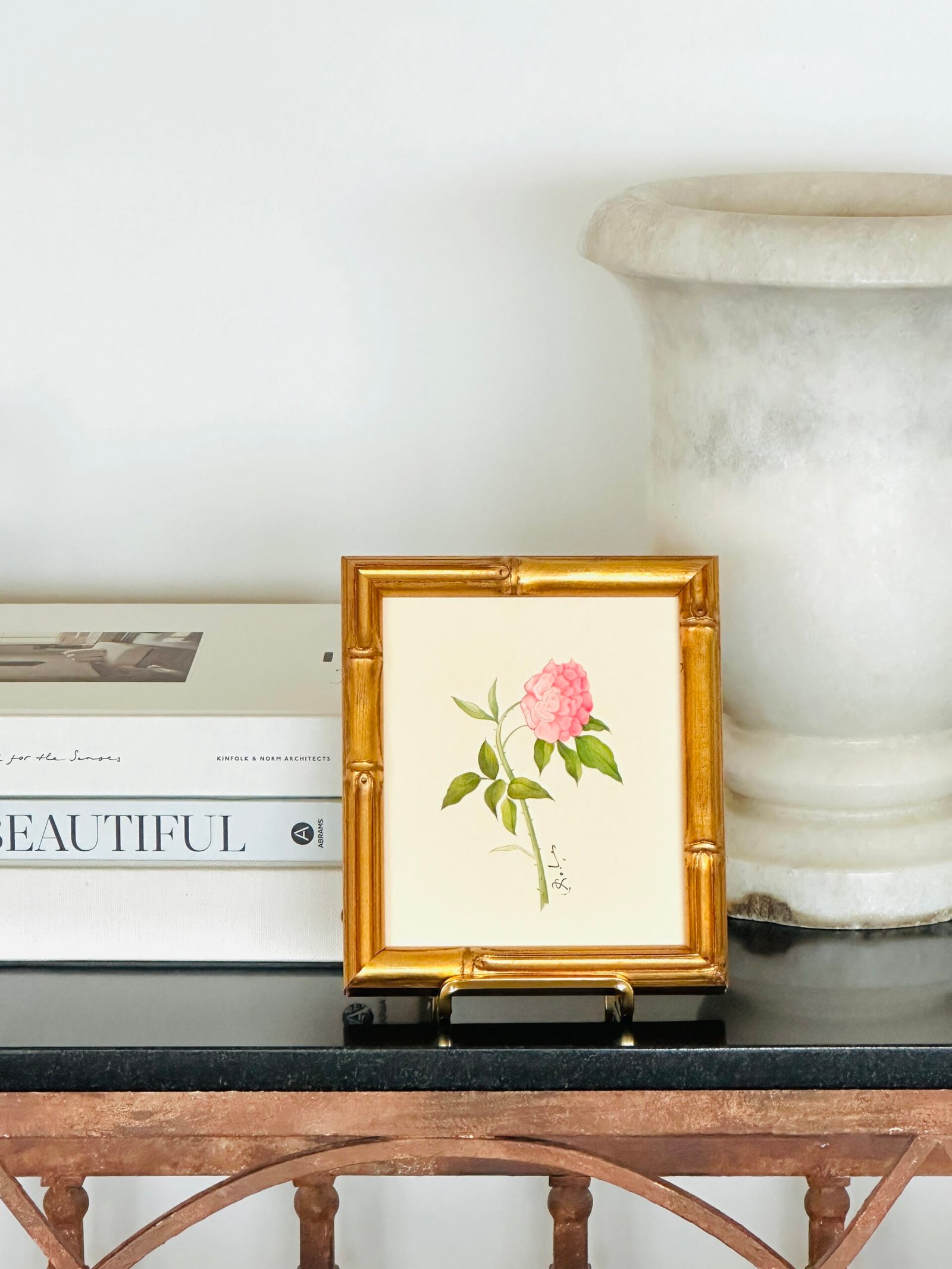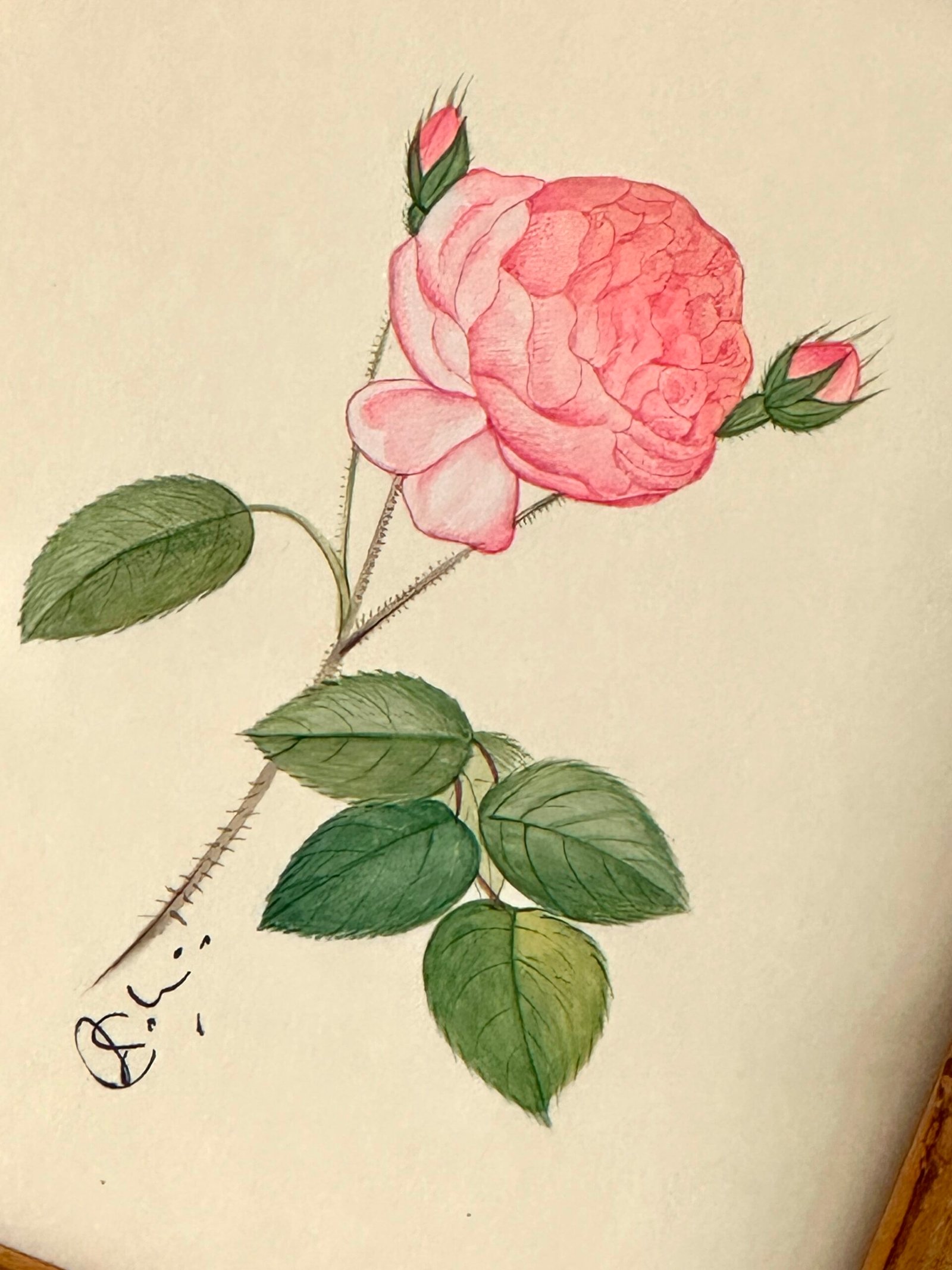 Hand-painted petal by petal in the softest blush pinks by our master artist. Delicate washes of color give the bloom its gentle depth, while fine line work brings every leaf, vein, and thorn to life. A timeless botanical with just the right balance of sweetness and detail… quietly elegant and endlessly charming.