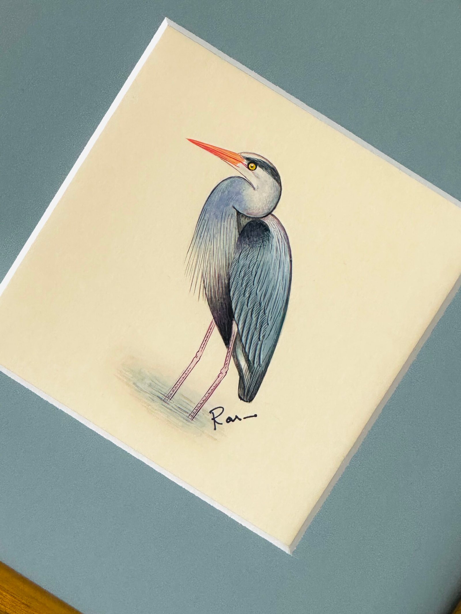 Meet Azure, our hand-painted heron—an elegant beauty full of charm and grace. His soft slate-blue feathers blend into delicate russet accents on the wings, each brushstroke carefully layered to capture his quiet majesty. With a long, graceful neck and a striking peach beak, Azure stands tall against a backdrop that comes to life with the matching blue mat and gleaming gold bamboo frame.