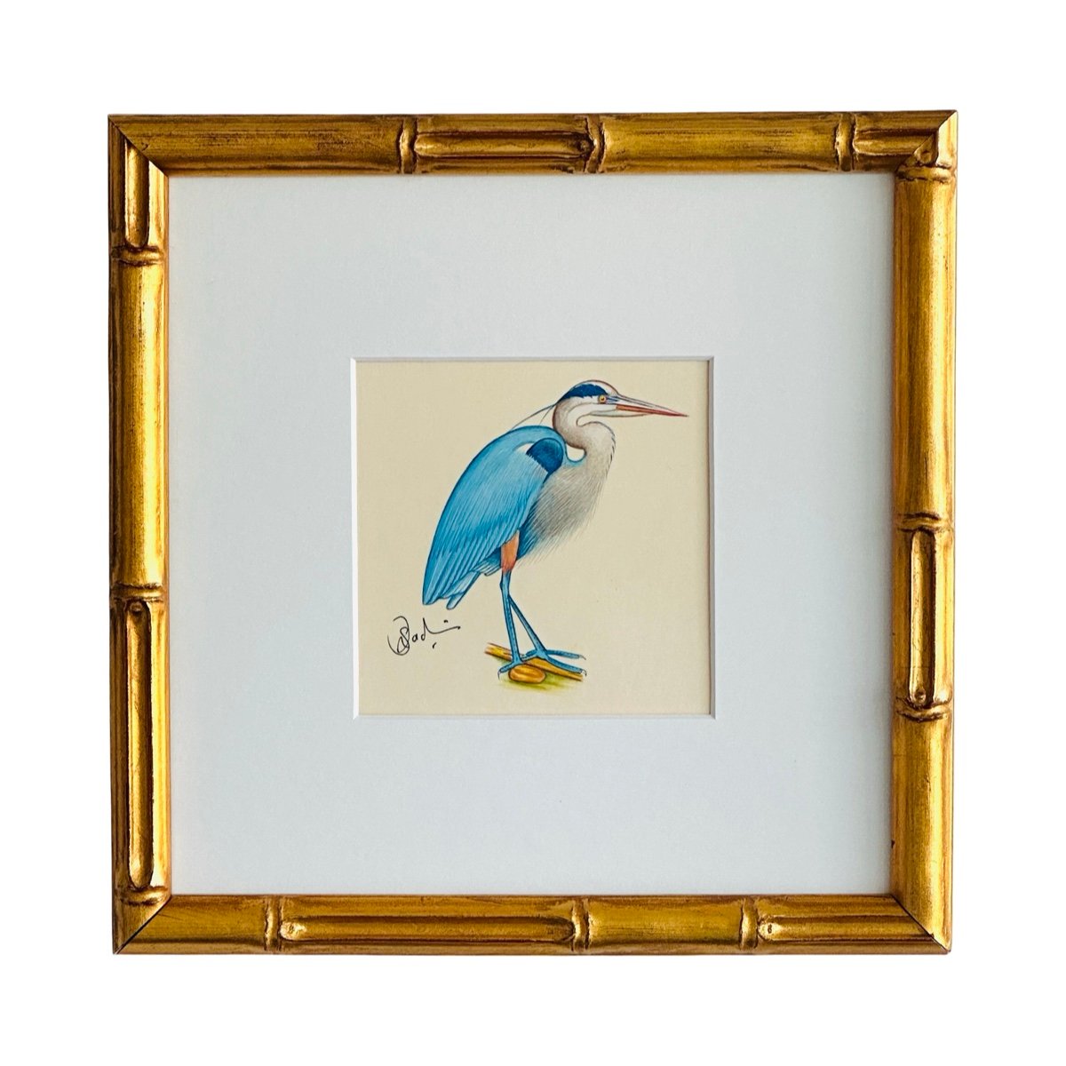 Meet Flurry, our hand-painted heron—an elegant beauty full of charm and grace. His soft slate-blue feathers blend into delicate russet accents on the wings, each brushstroke carefully layered to capture his quiet majesty. With a long, graceful neck and a striking peach beak, Flurry stands tall against a backdrop that comes to life in gleaming gold bamboo frame.
