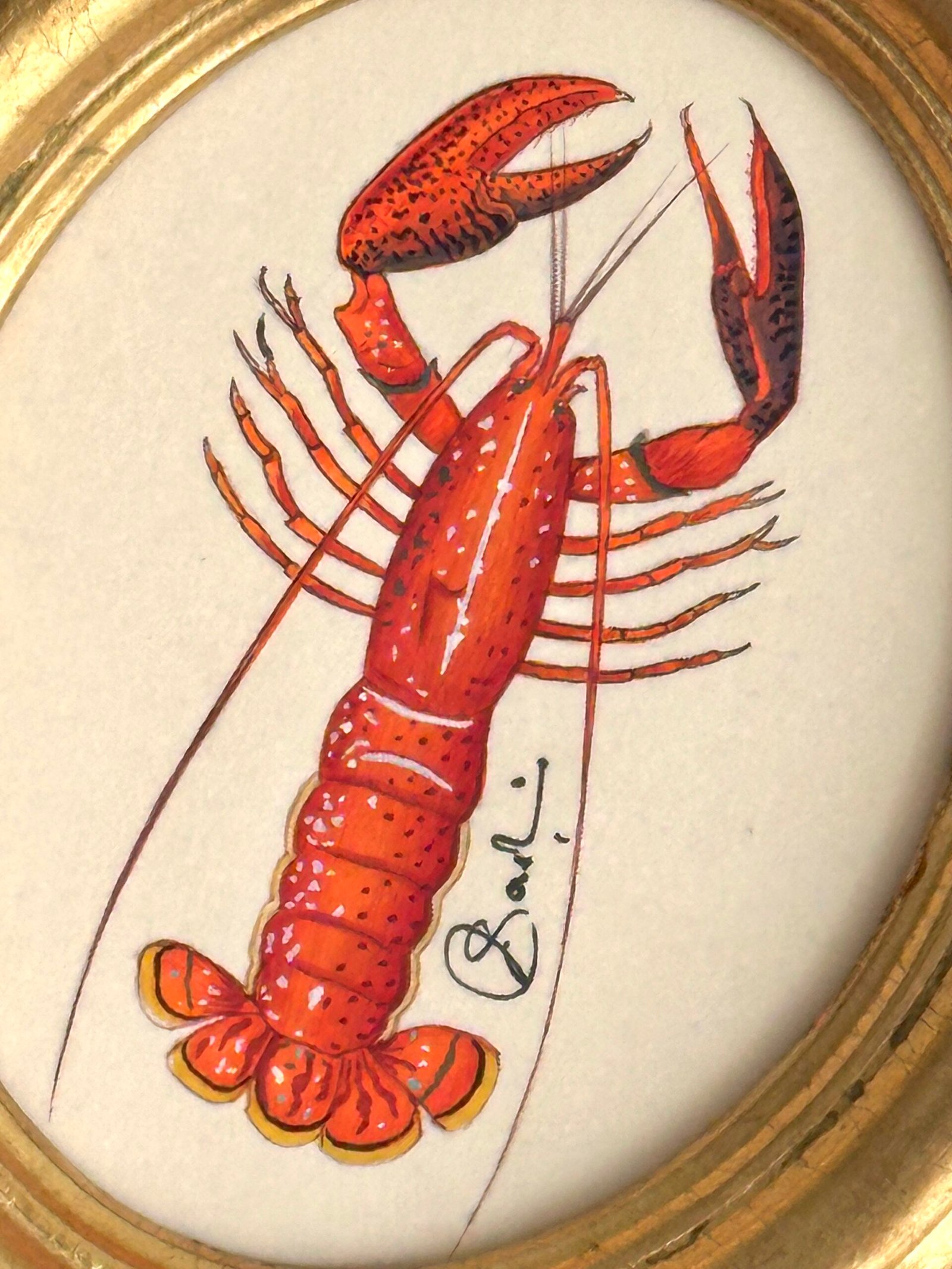 Meet Marigold, the sunniest orange lobster you ever did see 🧡🦞 — hand-painted in the most whimsical shade of citrusy glow and absolutely brimming with personality. Marigold’s claw-some charm lies in her bold, radiant orange hue, accented with dramatic black shading on her claw for just the right touch of contrast and flair. Painted stroke by stroke with love (and more than a few happy smiles), she’s a little bit cheerful, a little bit mischievous, and completely impossible to ignore — especially dressed up in that gorgeous gold frame.