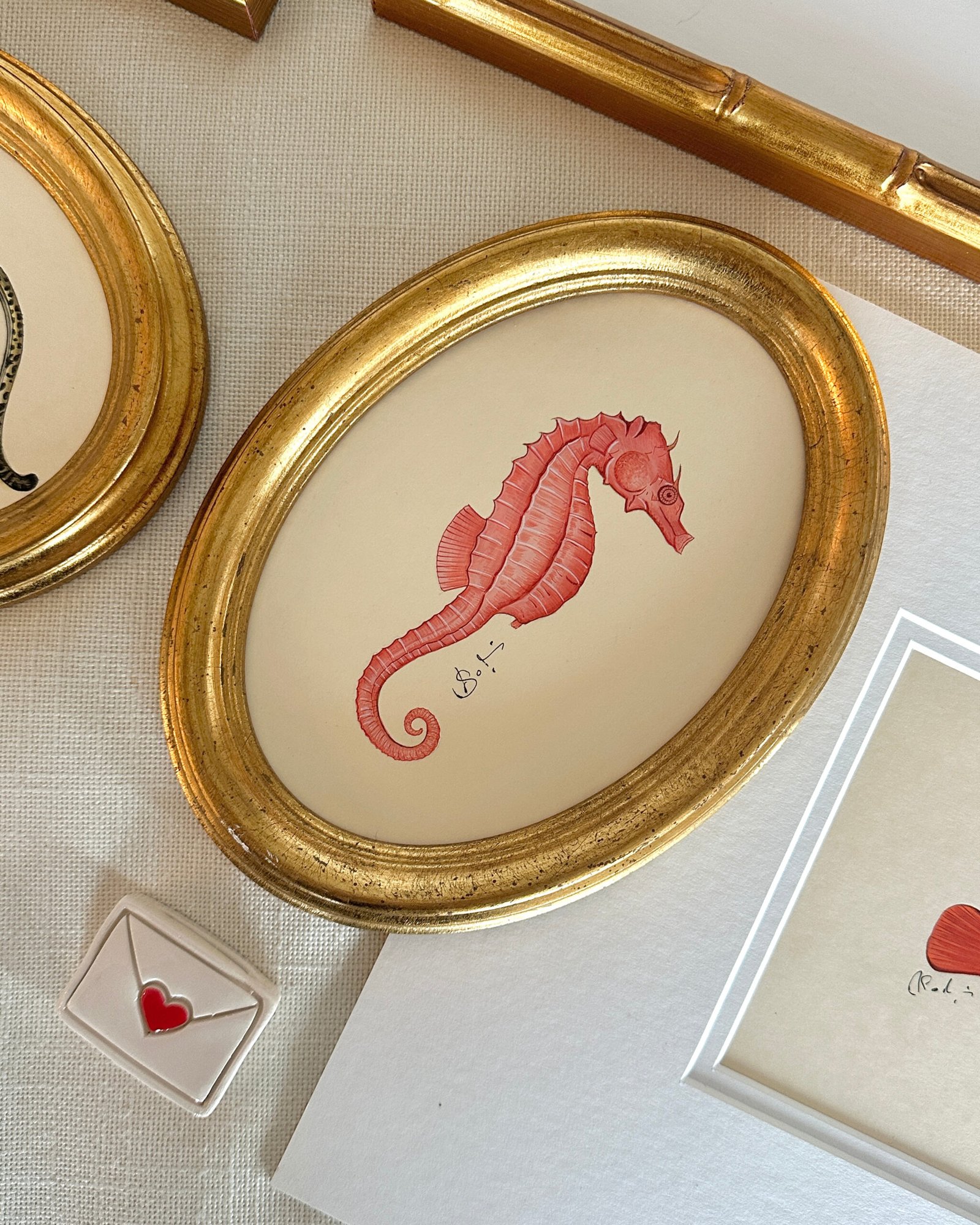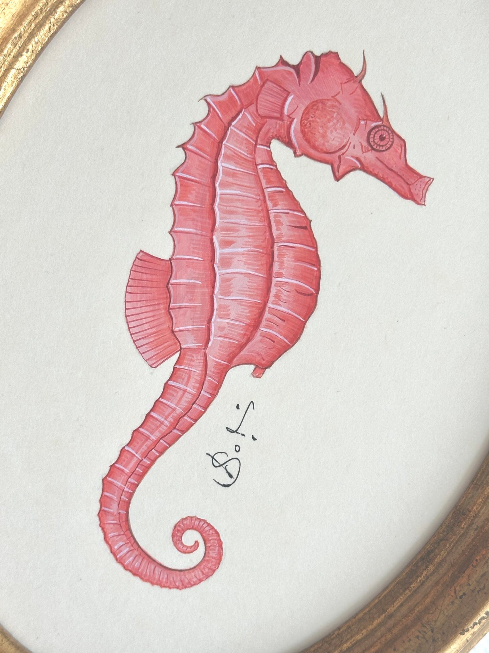 This seahorse is all about color and charm—painted in the dreamiest blush tones that feel soft, luminous, and just a little bit playful. The pink isn’t flat—it’s layered, deepened, and brought to life with the finest brushwork, so you’ll see those subtle shifts from rosy warmth to lighter highlights as you look closer.  And the detailing—so much to love. Each tiny ridge, every delicate curve, that perfectly curled tail… all outlined with the most precise line work and the gentlest shading to give it that almost sculpted feel. It’s whimsical, yes—but still so refined.