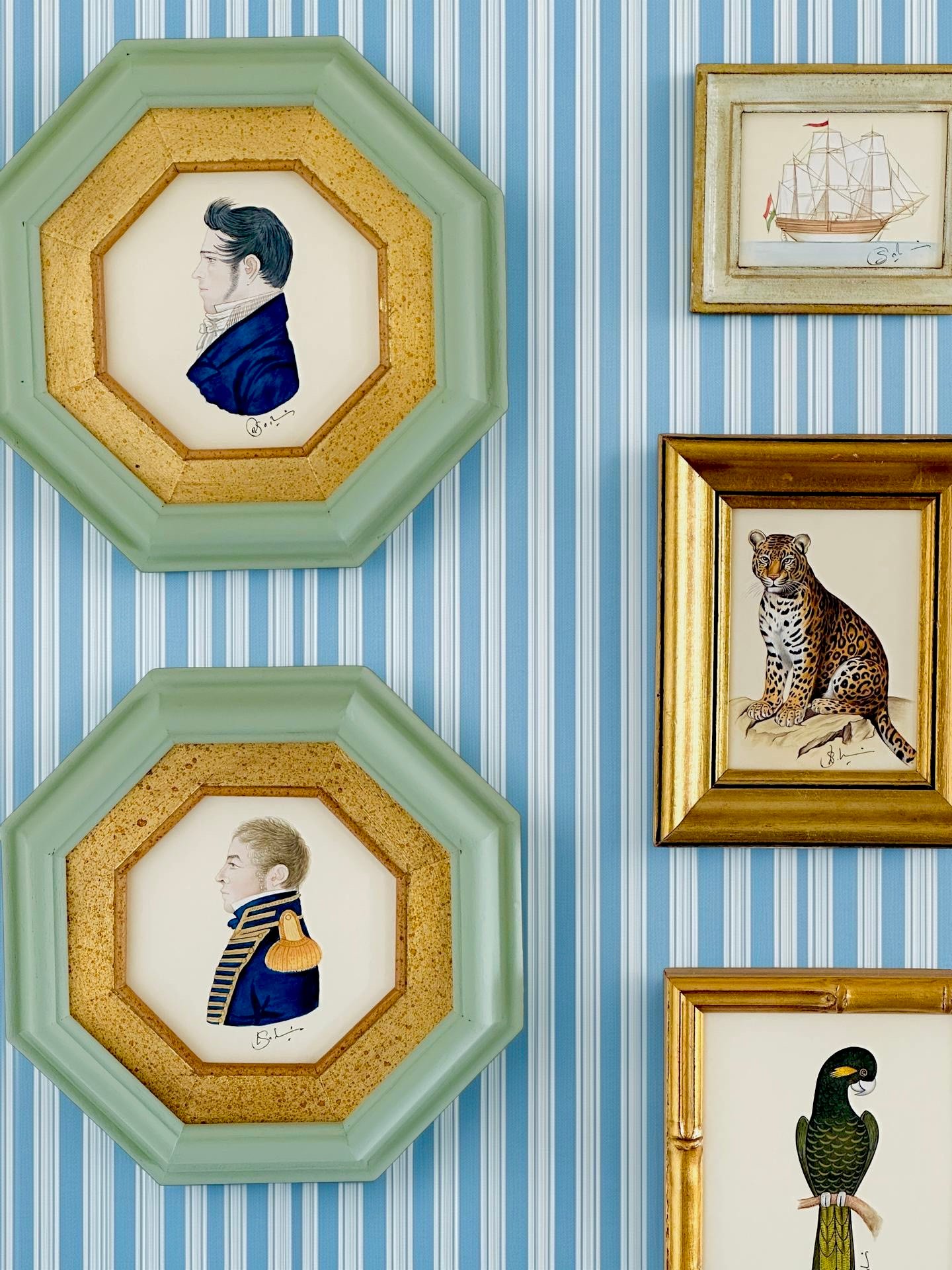 - Framed in a vintage Gold and Green Italian frame with glass. Frame has age-appropriate wear but overall in great vintage condition. The frame is partly hand-painted in a sage green color (mat finish), and as such, variations and irregularities in the finish are to be expected. These subtle imperfections are part of the charm and character of handcrafted work, making each piece truly one of a kind.